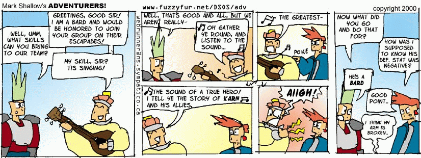 0 comments :: Saturday, March 08, 2003 :: Yesterday my two male siblings returned home from college. I haven't seen them in a while. My older sister is still at college, so there are only 6 people in my house right now. My family is going out to eat tonight, but I am not going to be able to attend due to the fact that I am going to be working. Speaking of work, I worked last night. It was quite interesting, as the people I shared a side with in the box office were Jesus(Kyle) and Grandpa(Andrew). For those of you who do not work at Showplace, you obviously do not know them. Jesus(which is short for Math-Jesus) and Grandpa(a.k.a. Princess, a.k.a. La Princesa, a.k.a. Fergy) both go to Harrison. They are seniors there. Jesus is planning on going to Purdue. I do not know Grandpa's plans. The evening was spent with Grandpa trying to explain to me why bards rock. That reminds me, tomorrow morning(1:00) is when I am going to get to create Timo the psionicist half-elf. Nothing much else to talk about here. I overheard an odd conversation at work last night, but I do not wish to discuss it. I can't remember any odd old people from last night, but they probably were there, I just have forgotten them. If I do remember anything I have plenty of time to post again before the day is out.